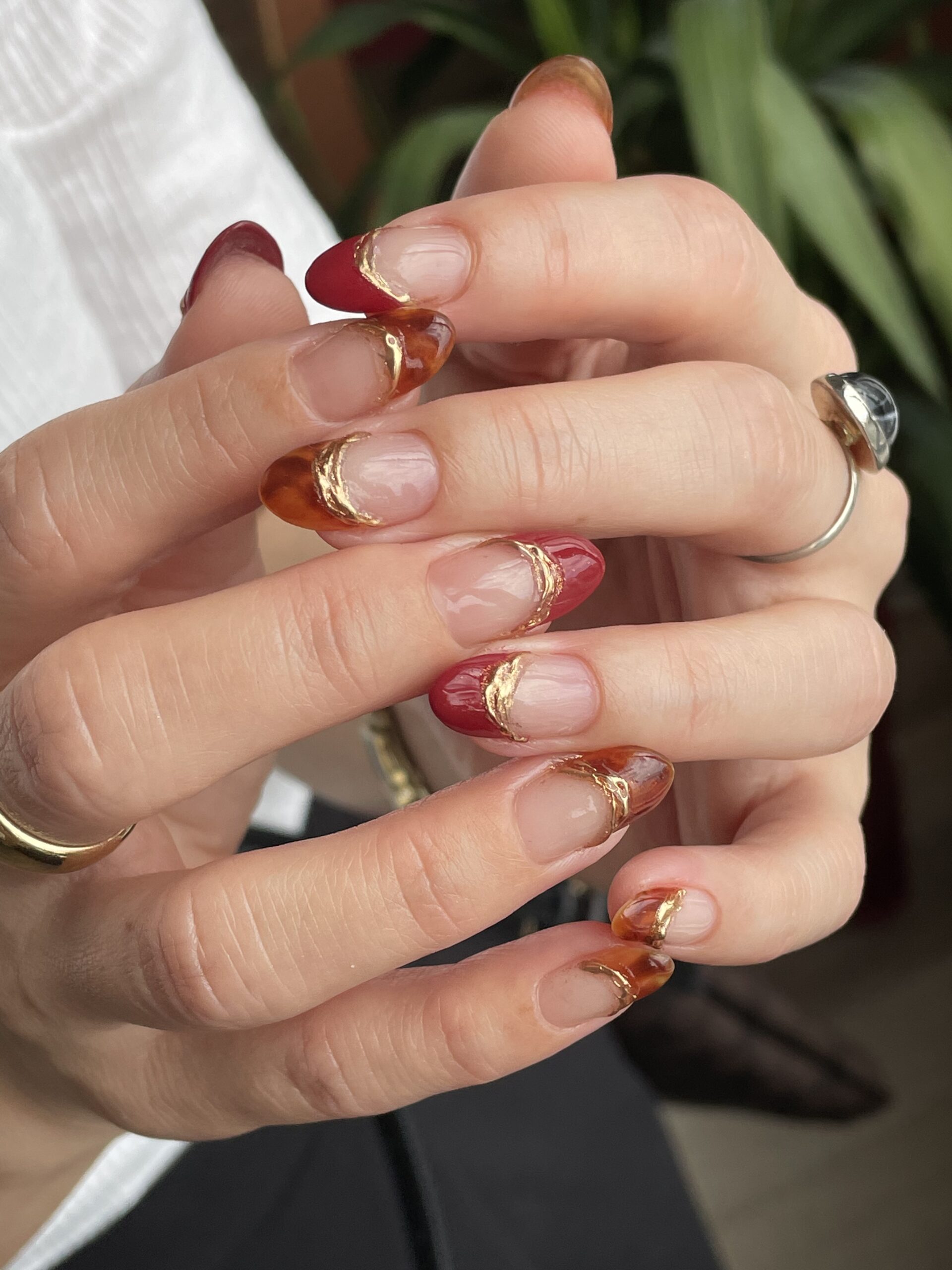 今日のオススメネイルは💅ボルドーと鼈甲のジュエリーミラーフレンチです。 秋らしくセクシーなデザインに仕上がりました。 指先から生まれる心の安らぎ❤️