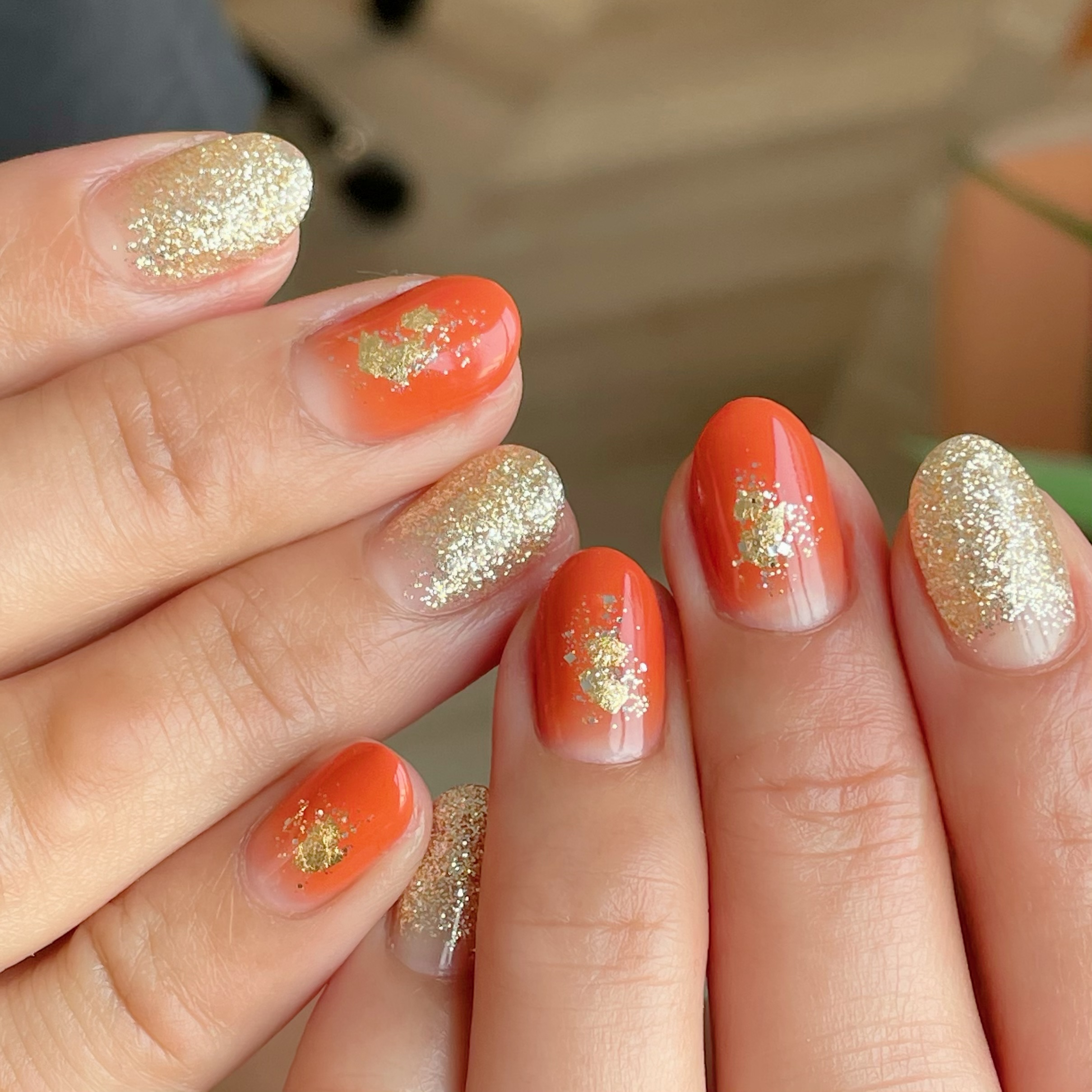 今日のオススメネイルは💅夏はもうすぐ✨オレンジネイルでキラキラ夏ネイルです。金箔が綺麗でした。 指先から生まれる心の安らぎ❤️