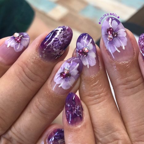 シアーパープルのお花ネイルです。立体感が出せるアートです。