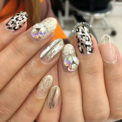 今日のオススメネイルはシルバーのキラキラネイルです🎶 ラメやミラーファイル・チェーンやストーン、異素材でキラキラにしました。クリスマスや忘年会に目立つ事、間違いなし🎶