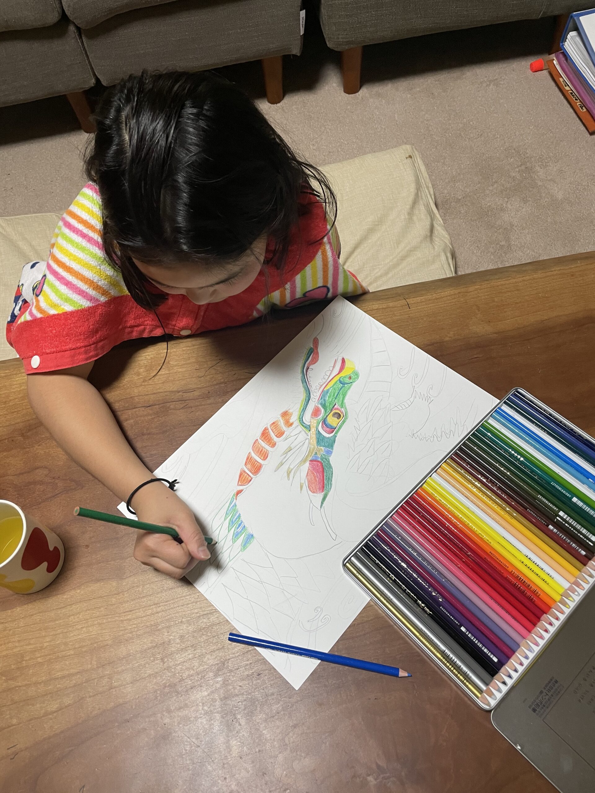 最近は毎晩、子ども作品による平和祈願展『日光東照宮の国宝、霊獣を描こう‼︎』に提出する絵を毎日少しずつコツコツ描く娘です。
