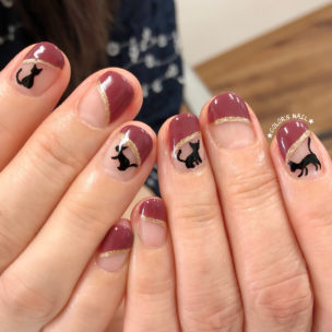 今日のオススメネイルは💅ニャンコのシルエットを手描きした個性的なフレンチネイルです。