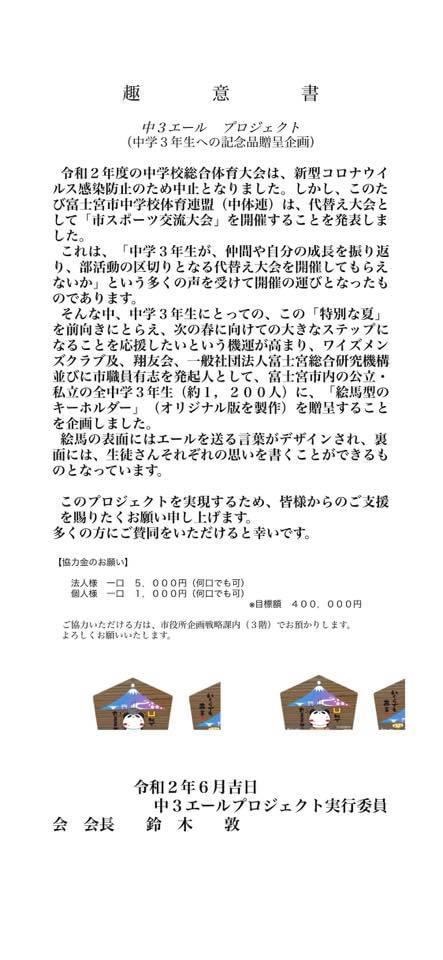 昨日は富士宮市役所三階 企画戦略課へ行ってきました。 中学校最後の夏を応援しようと、エールプロジェクトが立ち上がっていますょ。 裏にそれぞれの思いが書ける 絵馬型のキーホルダーをプレゼントするそうです。