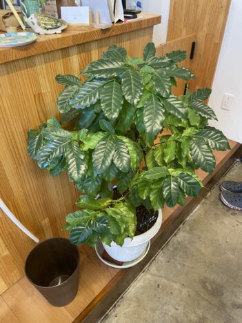 コーヒーの木もあるの 艶々の新しい葉っぱも出てきていた〜 うちの子もこんなに大きくなるのかなぁ〜 ⬇️