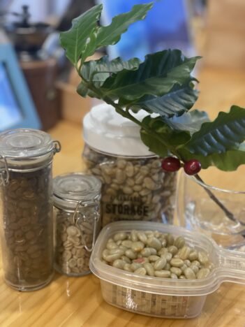 コーヒーの赤い実を剥いて種を出して、種の皮を更に剥いて焙煎前のグリーンコーヒーに、そこから焙煎してコーヒーに
