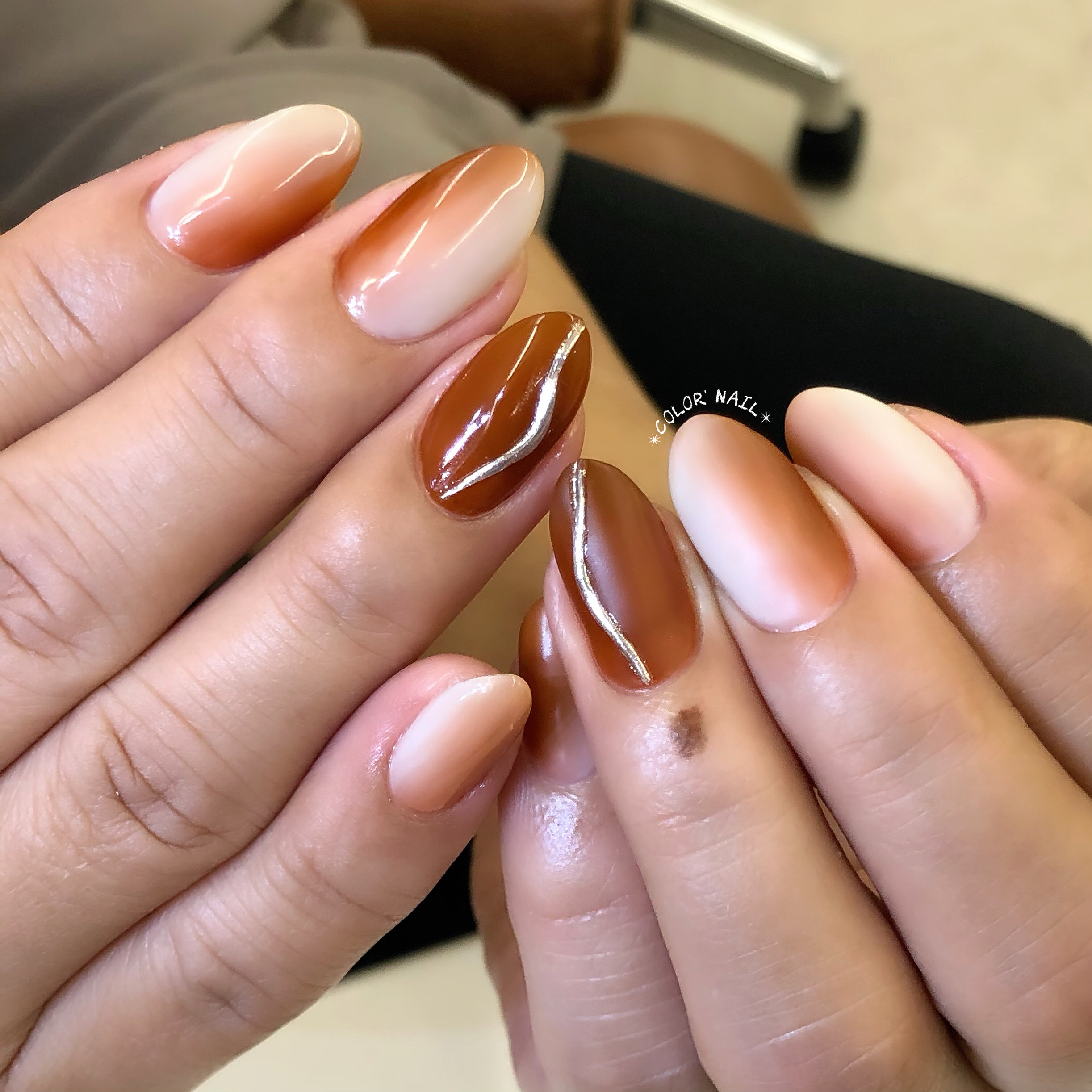 ベージュとブラウンの縦グラデーションネイル💅 右手は艶々仕上げ・左手は陶器みたいなマット仕上げにしました。 同じカラーなのにこんなに雰囲気が違って素敵です✨ 指先から生まれる心の安らぎ❤️