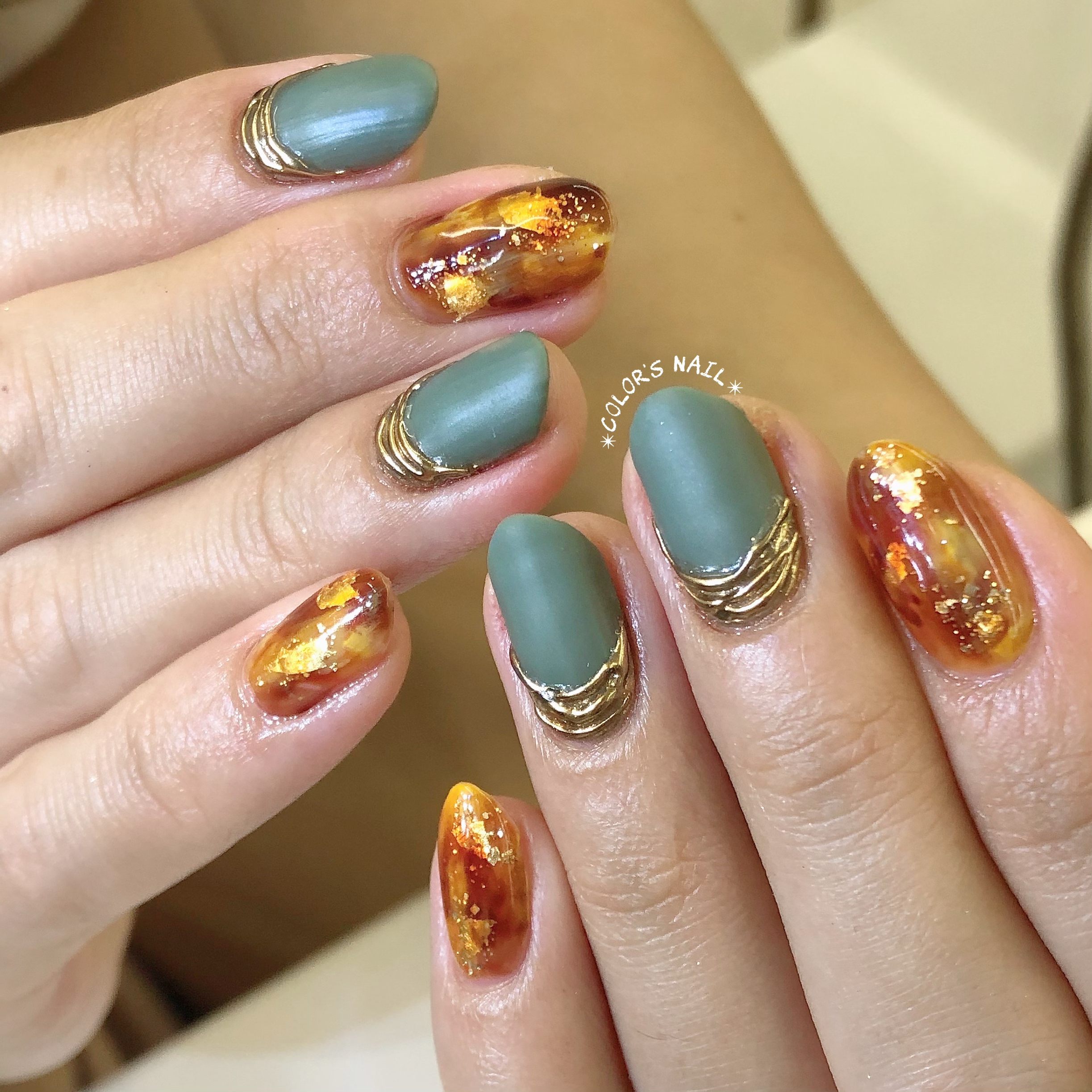 今日のオススメネイルは💅マットなスモーキーグリーンとジュエリーネイルに大柄な鼈甲を合わせました。指先から生まれる心の安らぎ❤️