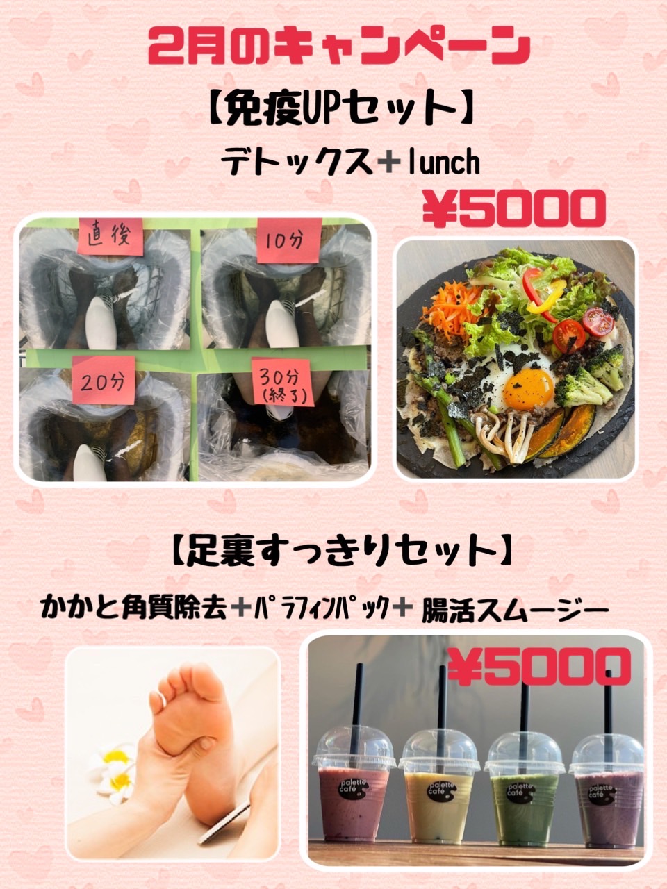 2月はネイルとcaféのコラボキャンペーンやってます! デトックスと腸活ランチセット・角質除去と温活パラフィンパックと腸活スムージーセットの2種類の免疫力アップキャンペーンです。
