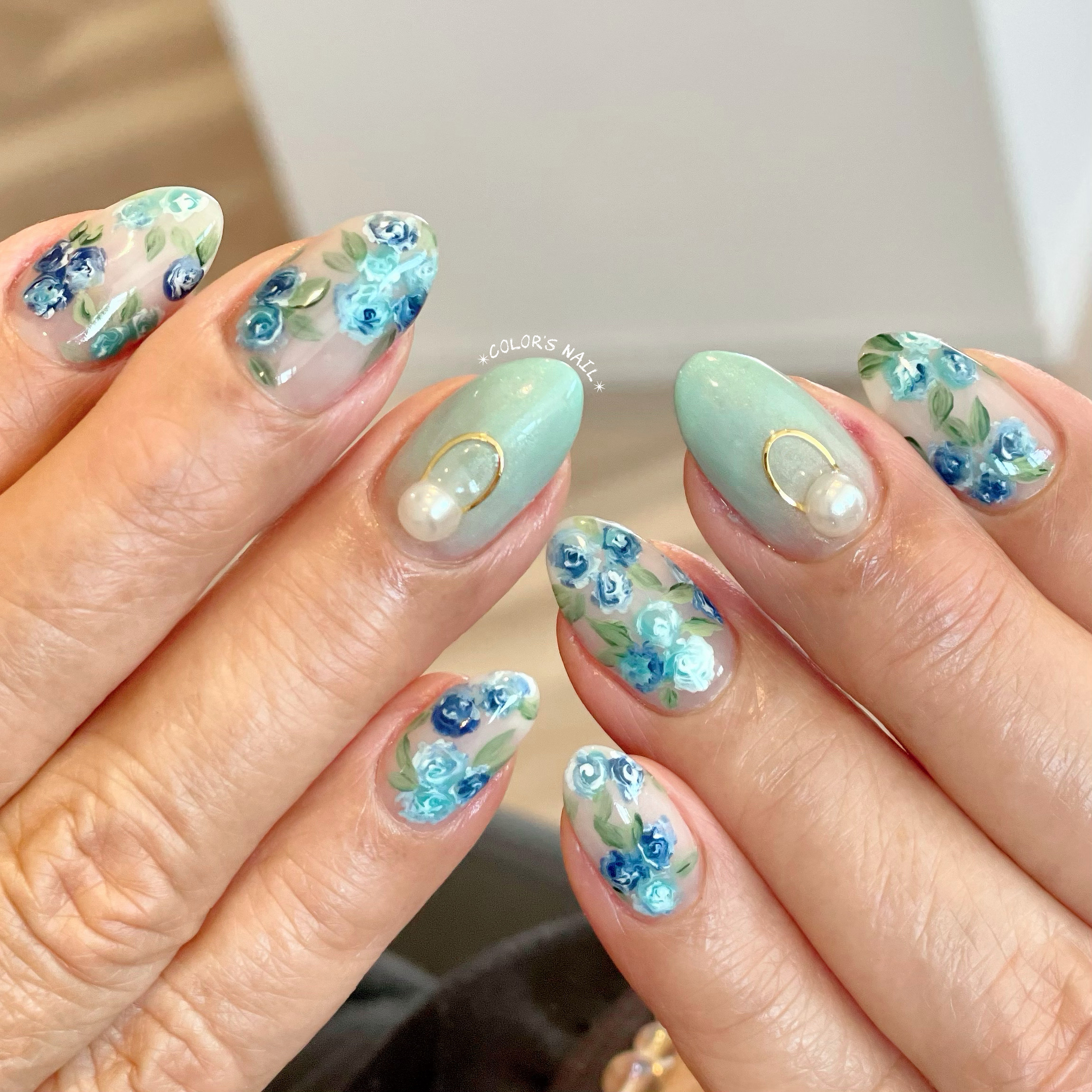 今日のオススメネイルは💅小花の薔薇を散りばめた春ネイルです✨ 指先から生まれる心の安らぎ❤️
