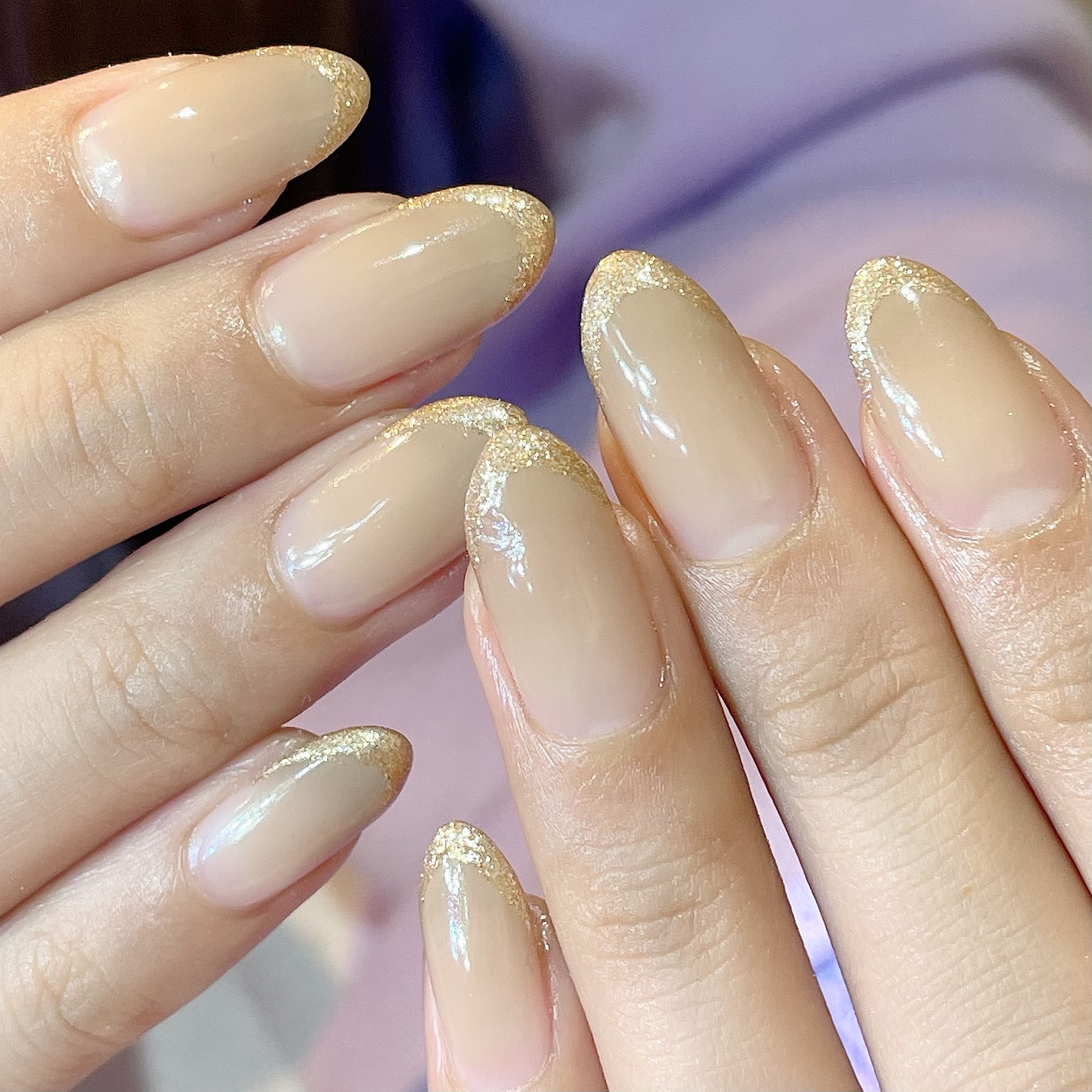 今日のオススメネイルは💅肌馴染みの良いベージュに細いゴールドフレンチの上品なネイルです✨ 指先から生まれる心の安らぎ❤️