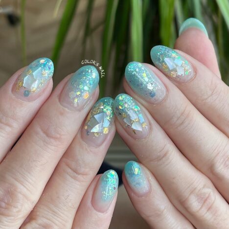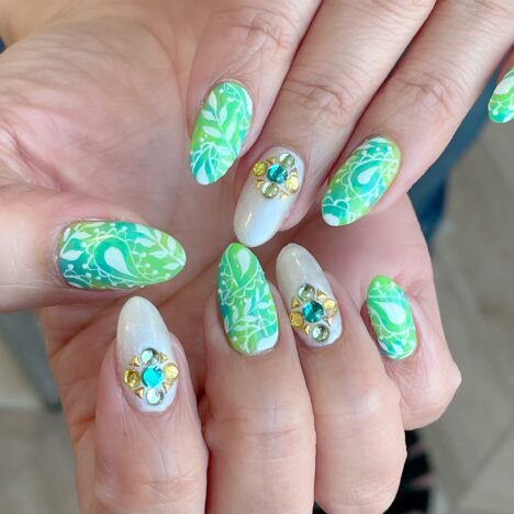 今日のオススメネイル💅 新緑カラーが人気です✨ 手描きのペイズリーとシアーネイルです。 指先から生まれる心の安らぎ❤️