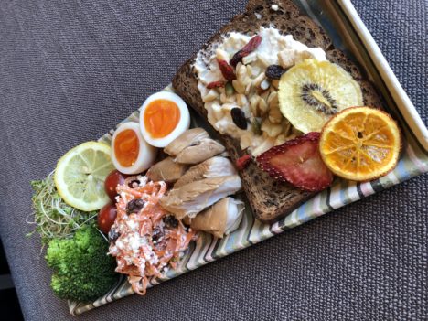 今日のワンプレートブランチにトッピングしました🎶 プロテインブロートをトースターで焼いて、豆乳ケフィアを塗ってドライフルーツを飾るだけ。 茹で卵はお気に入りの糠漬けです。