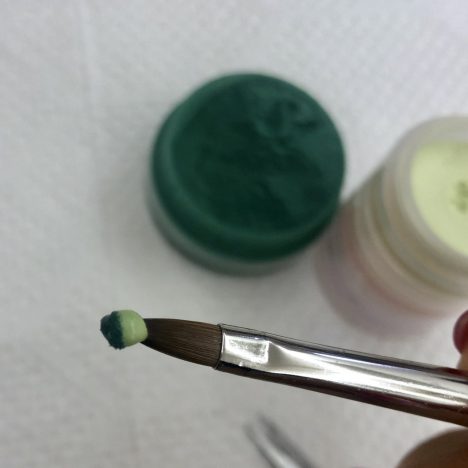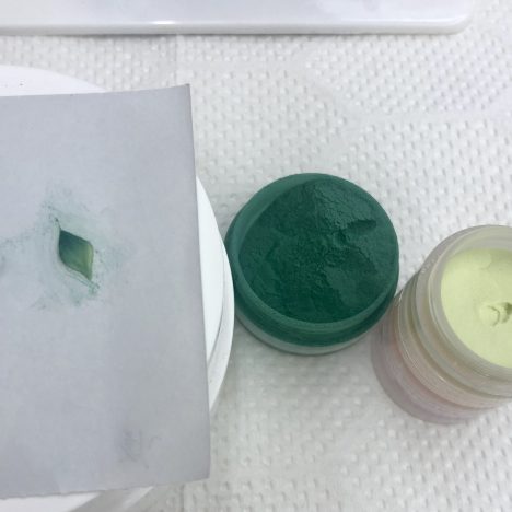 ②筆に濃い緑と薄い緑のパウダーを同時に2色とります。