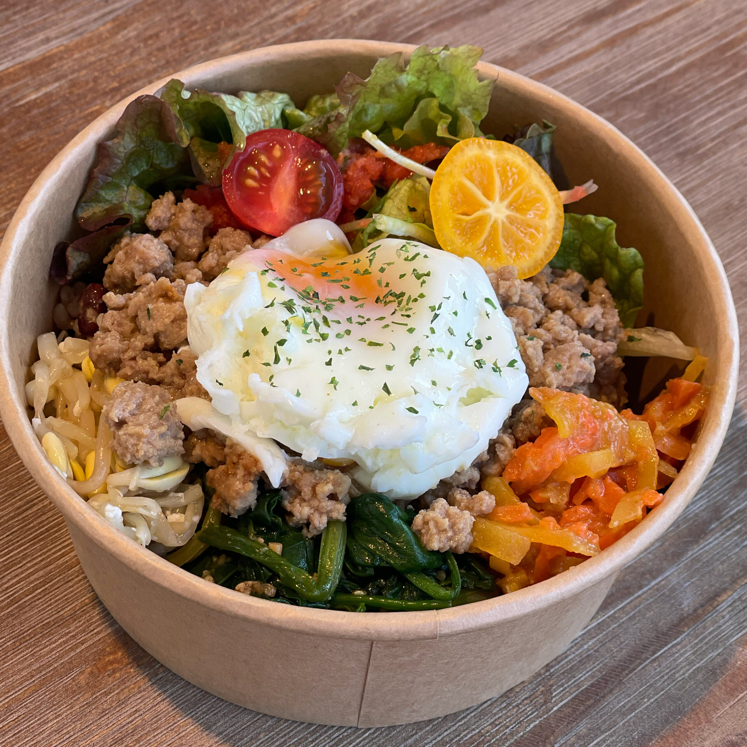 テイクアウトはご飯もできます。 今日のテイクアウト出来るぱれっとボールは、美肌ナムルの発酵ビビンバです。 お電話で予約していただくと夕飯用のテイクアウトも出来ます。