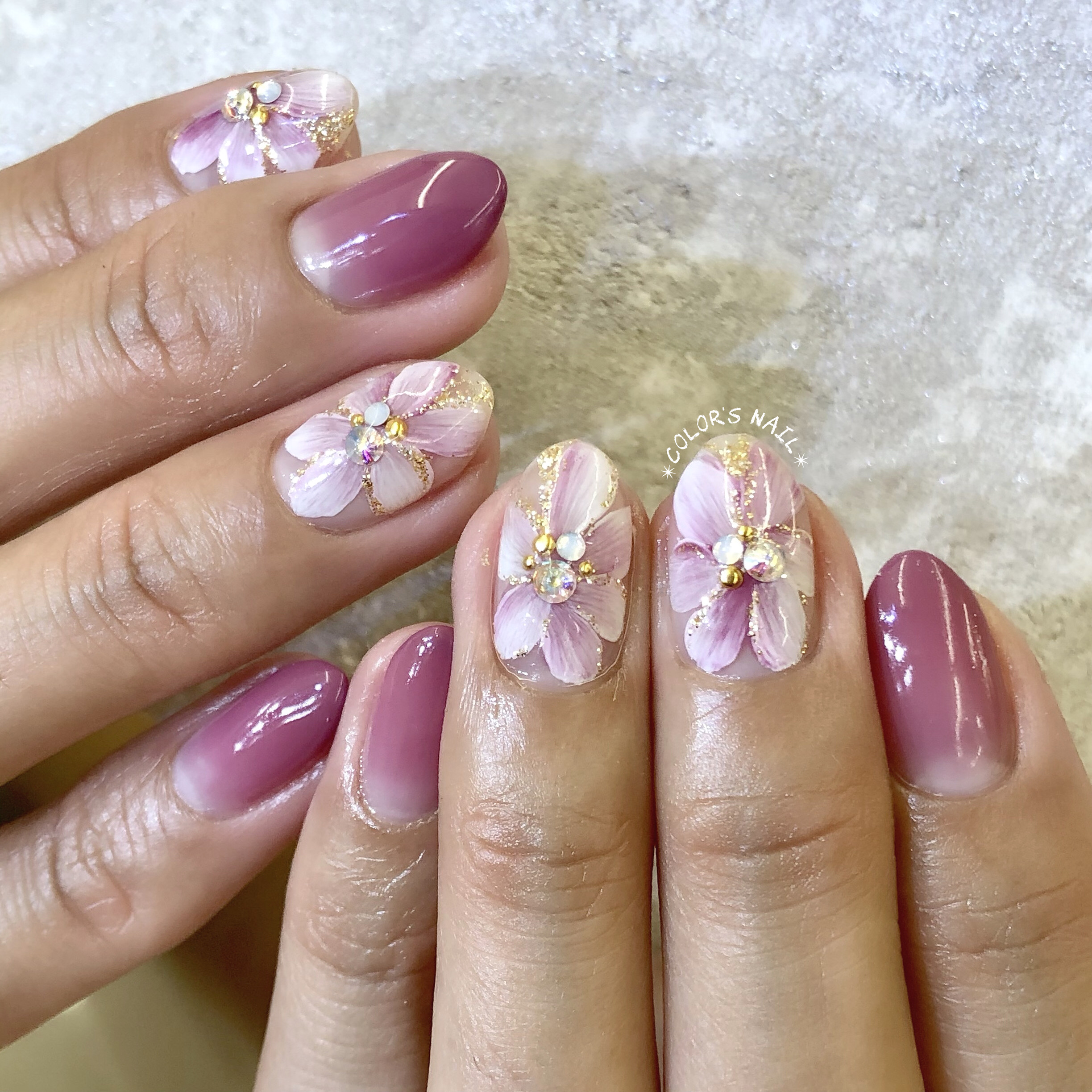 今日のオススメネイルは💅前面に大きく描いた立体的なFlowerネイルです✨ 上品で大人可愛いネイルに仕上がりました。 指先から生まれる心の安らぎ❤️