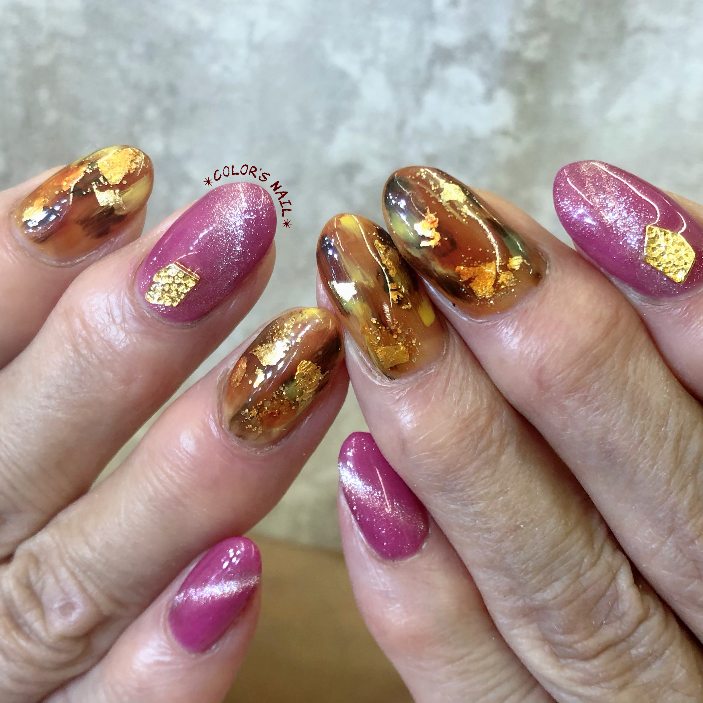 2つ目はピンクミラーも大柄の鼈甲ネイル 秋らしくて、金箔が華やかですね〜✨