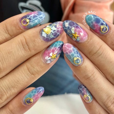 ベースにピンク・ブルー・パープルをランダムに塗って、上に水面を描いてます!