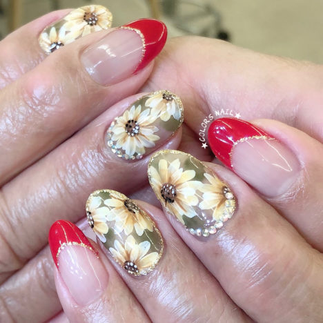 今日のオススメネイルは💅手描きのヒマワリネイルです🌻 赤フレンチと合わせて可愛い😍 指先から生まれる心の安らぎ❤️