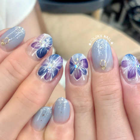 ブルーグレーのカラーにパープルとブルーの大輪のお花を描いた爽やかなネイルです✨