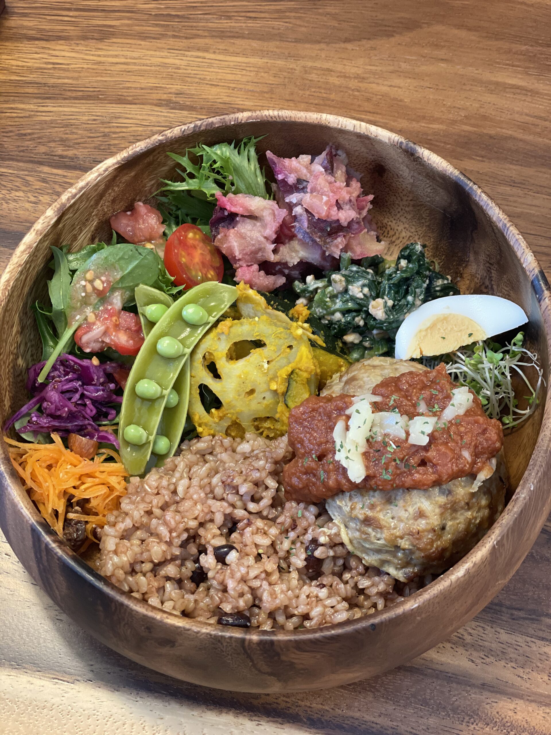 今日のpalette cafe のメニューはハンバーグですよ。 オーガニック野菜は自家製発酵調味料で調理しております。 美肌・美ボディーに! ごはんは未来の自分への投資❤️