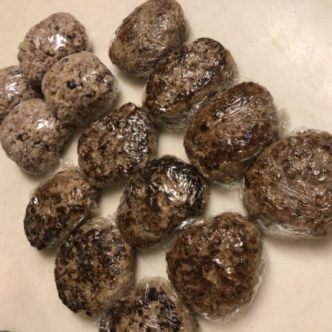 焼いてラップに包んで冷凍して食べる時に1つずつ使います。玄米ごはんも同様に計って1個100gで冷凍です✨