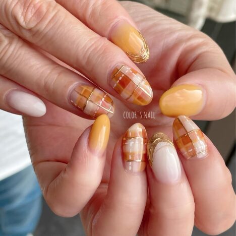 今日のオススメネイルは✨Autumnカラーのチェックネイル💅 季節感を楽しんで毎月チェンジ✨ 指先から生まれる心の安らぎ❤️