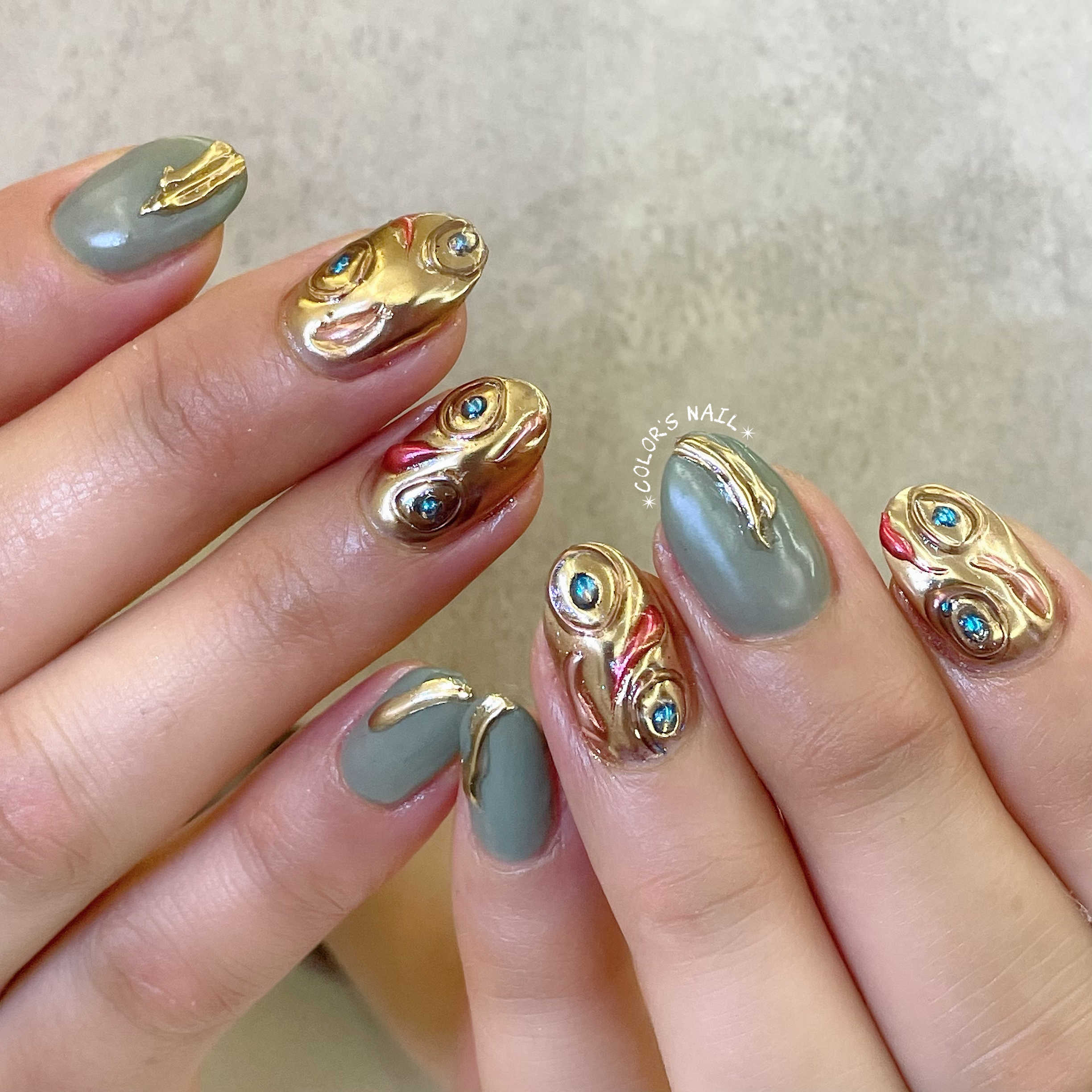今日のオススメネイルは💅新しい年を迎えるのにピッタリなお正月用のキラキラミラーネイル&ジュエリーネイルです。 手描きで立体アートを描いてます。 指先から生まれる心の安らぎ❤️