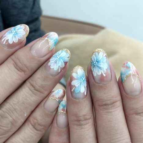 今日のオススメネイルは、アンティークフラワーネイルです。優しいカラーフレンチとコラボして『癒されネイル』になってます。