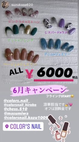 今COLOR’S NAIL富士店にて豪華なデザイン込みでジャスト6,000円キャンペーンやってます。 お電話にてお問い合わせご予約お待ちしております。 ☎︎0545621716
