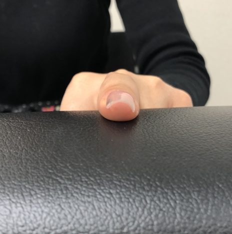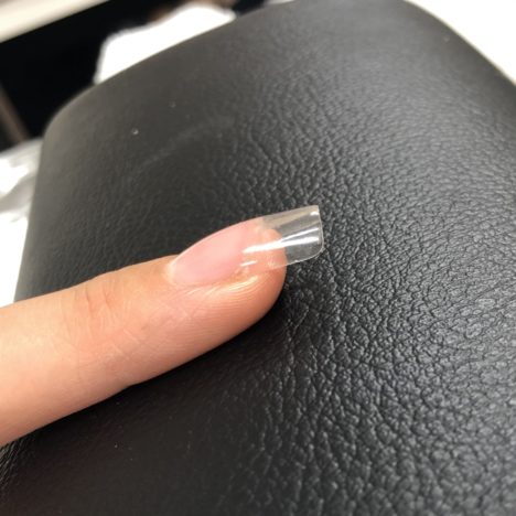 本日のデモはジェル検定上級のジェルスカルプです。 横から見た時にキューティクルと先端のちょうど真ん中にハイポイントが来るようにする事。サイドストレートもストレスポイントを削らないように真っ直ぐにね!
