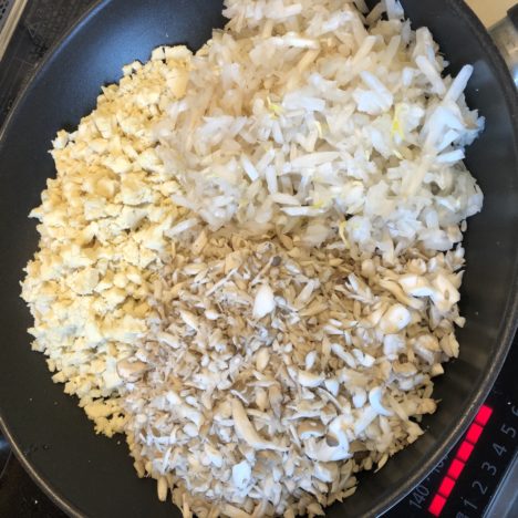 高野豆腐としめじともやしを炒めて玄米と混ぜてヘルシーにカサ増し〜