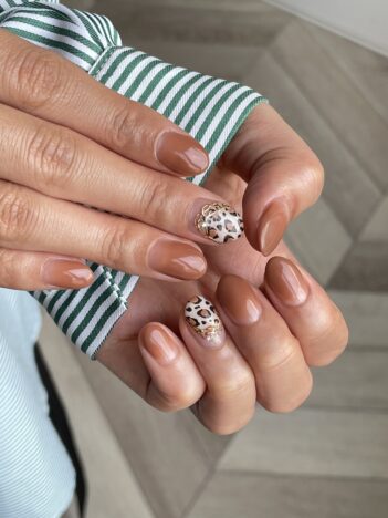 今日のオススメネイルは💅 秋カラーにワンポイントレオパードのネイルです。カラーはチェスナットブラウン( chestnut brown)