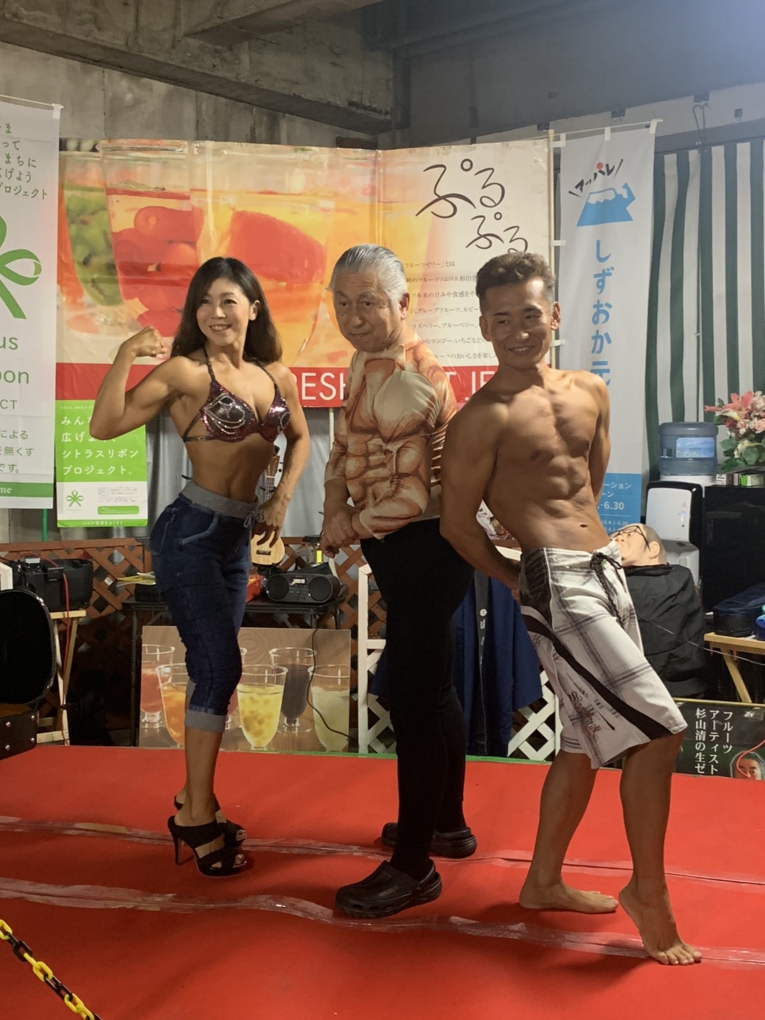 杉山フルーツの清エンターテイナーと光月堂のマッスルかずぴーとのスリーショットも撮っていただきました。