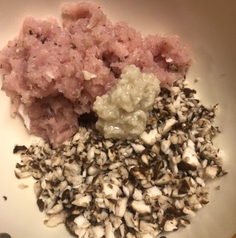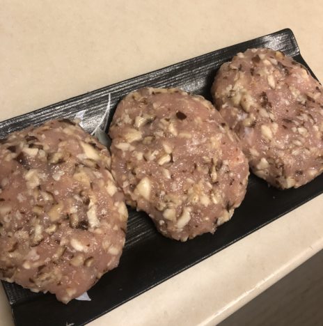 鶏ささみ300gで挽肉を作り、椎茸4個と混ぜて大きなハンバーグが3個出来ました。