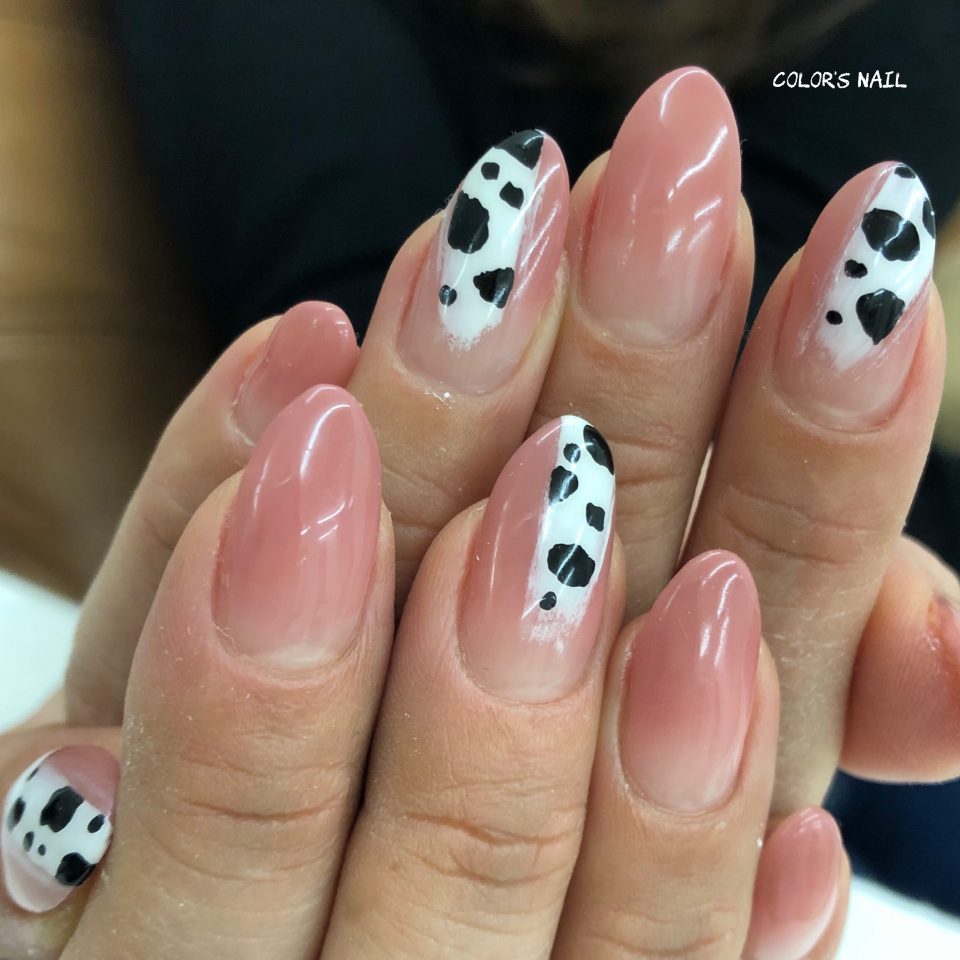 今日のおすすめネイルは 塗りかけネイルです。塗りかけの中にダルメシアン柄を入れてみました。
