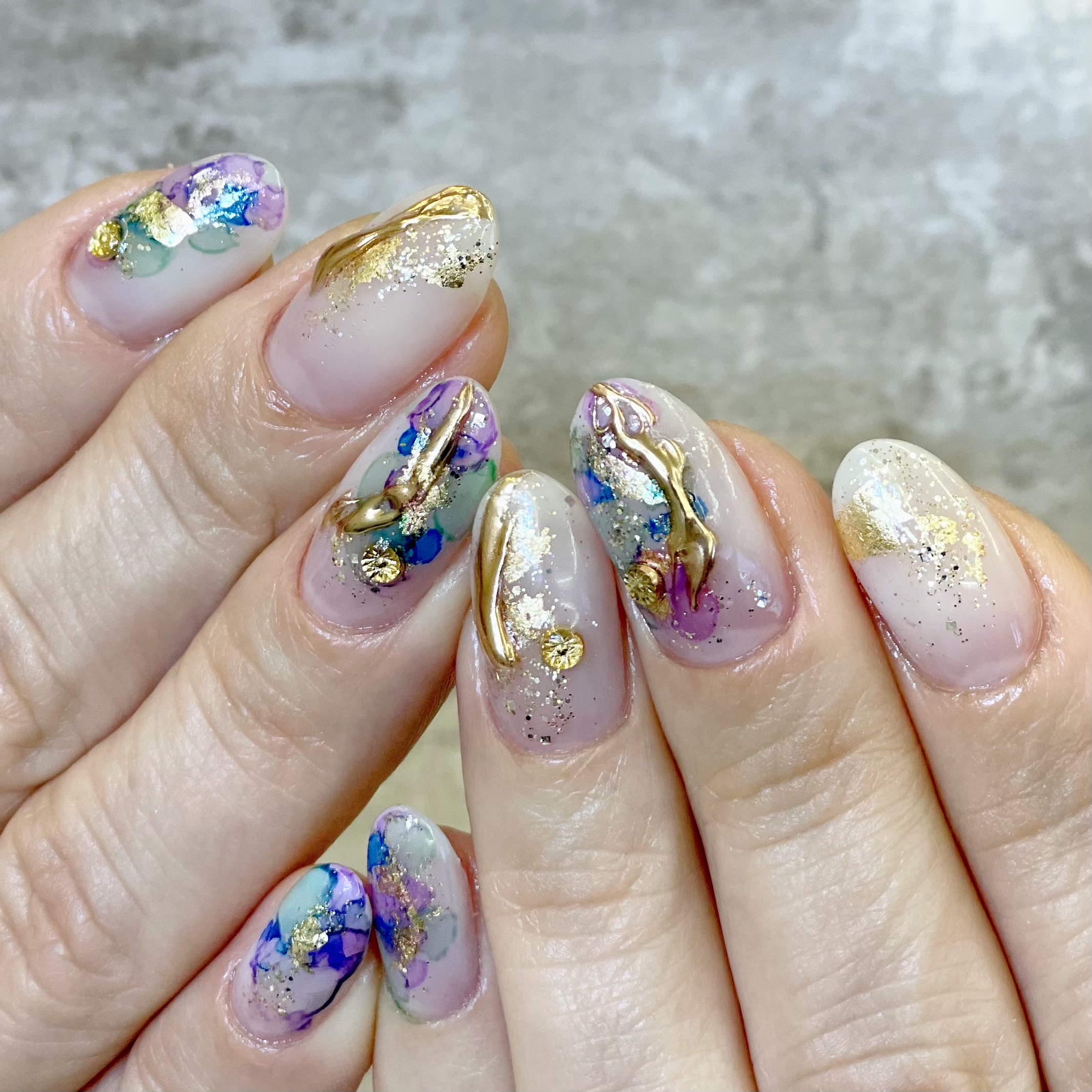 今日のオススメネイル💅 ホワイトカラーに垂らしこみをして、金箔を散りばめて、ジュエリーネイルもプラスしたゴージャスなお正月仕様のネイルです♪   指先から生まれる心の安らぎ❤️