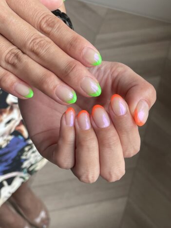 今日のおすすめネイルはオーロラミラーにネオンのアシメフレンチ✨ 指先から生まれる心の安らぎ❤️