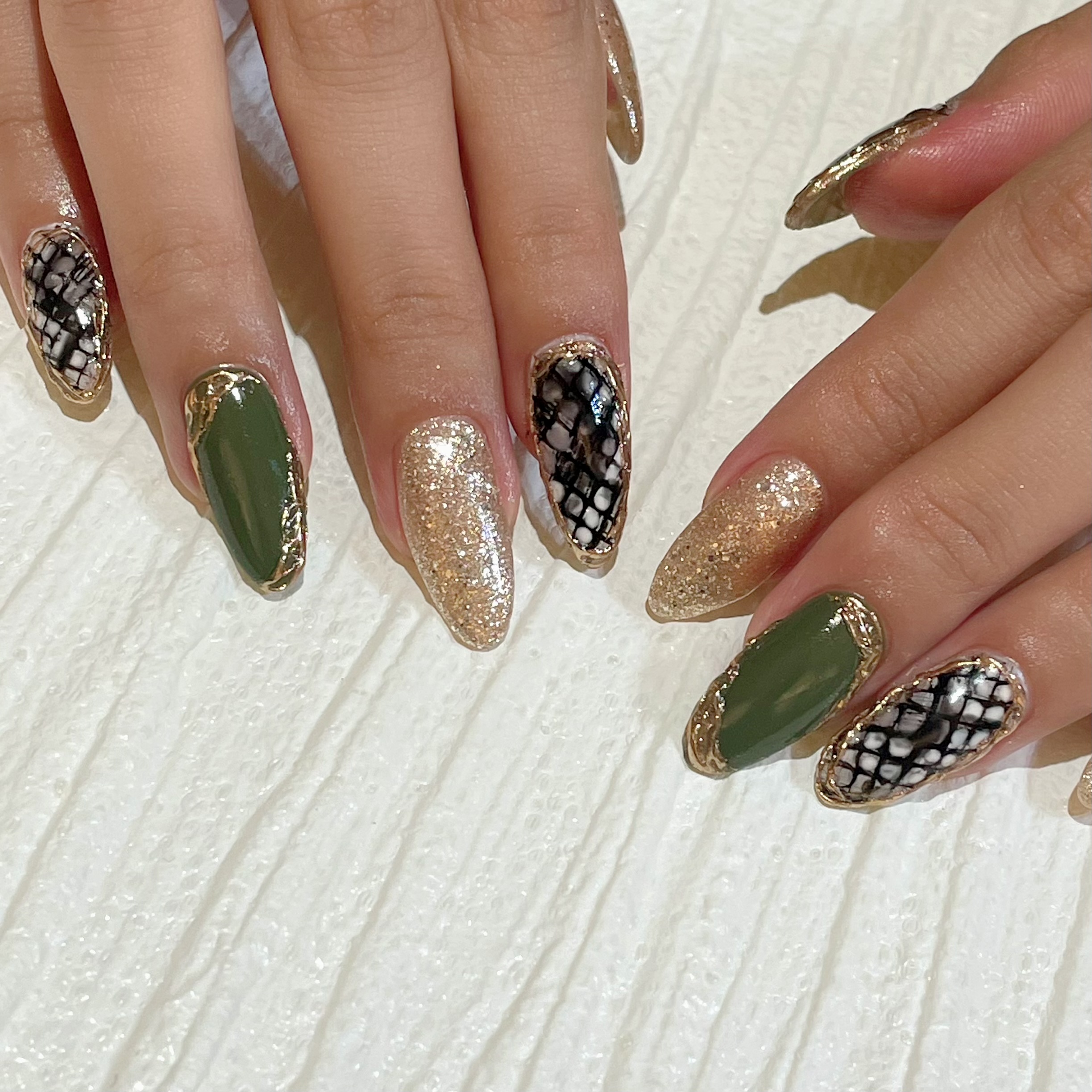 今日のおすすめネイルは💅お客様の持ち込み画像アレンジ✨ 手描きのパイソンと秋カラーを合わせました。 指先から生まれる心の安らぎ❤️