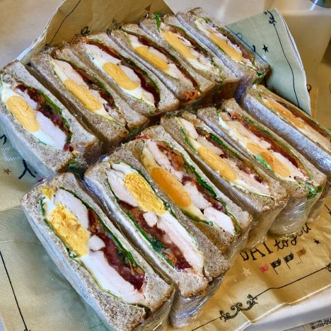 私の担当はサンドウィッチ🥪 次女がおかず、三女はおにぎりを作りました。