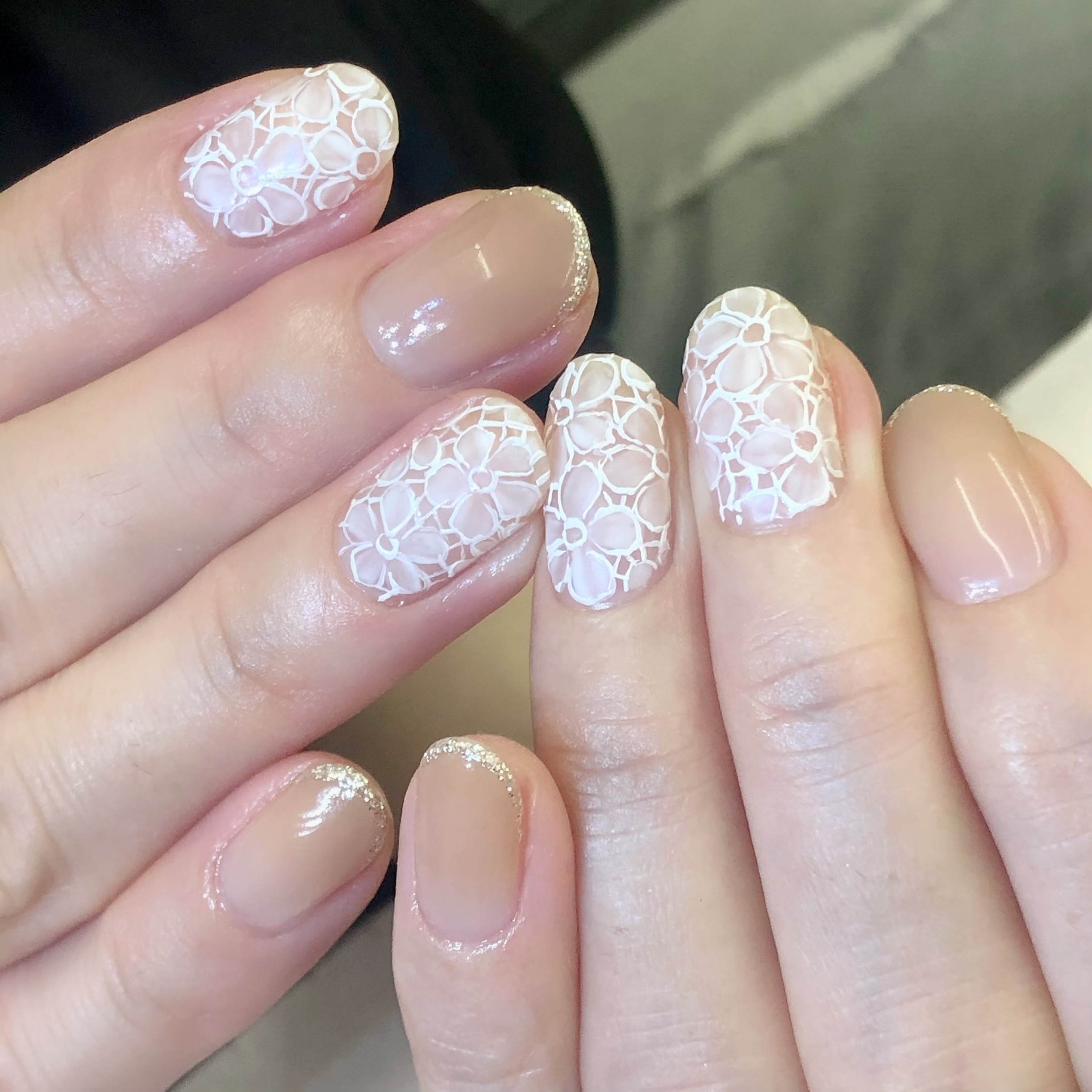 今日のオススメネイルは💅手描きのレースネイルです✨ ワンポイントにレースが入っているとシンプルなのに上品に豪華です✨ 指先から生まれる心の安らぎ❤️