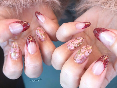 今日のオススメネイルは💅フレンチネイルにフラッシュクリッターを重ね塗り✨ポイントでお花のアートを描きました✨指先から生まれる心の安らぎ❤️