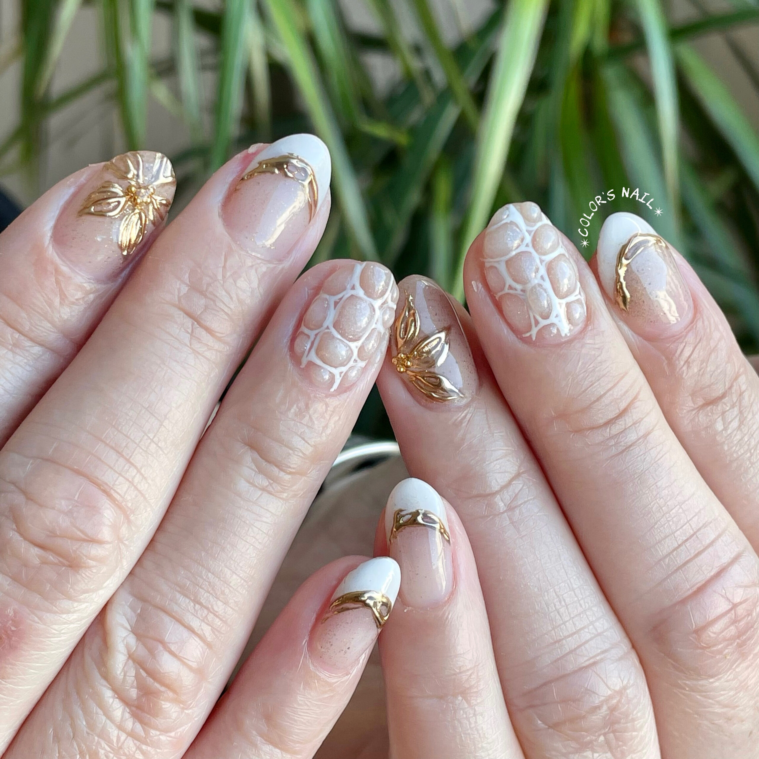 今日のオススメネイルは💅お客様の持ち込み画像をアレンジしたクロコダイルネイル✖︎ジュエリーフラワーです。 まだ寒いけどネイルも少しずつ春です。🌸