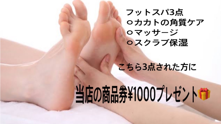 3点スパ(かかとの角質ケア.浮腫取りマッサージ.スクラブ保湿)された方に当店の¥1000分の商品券差し上げます♬